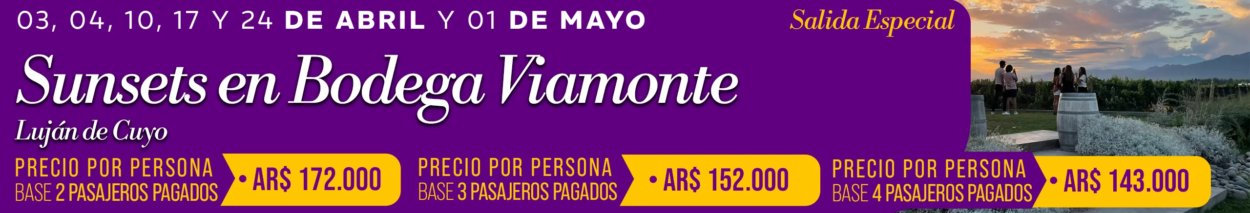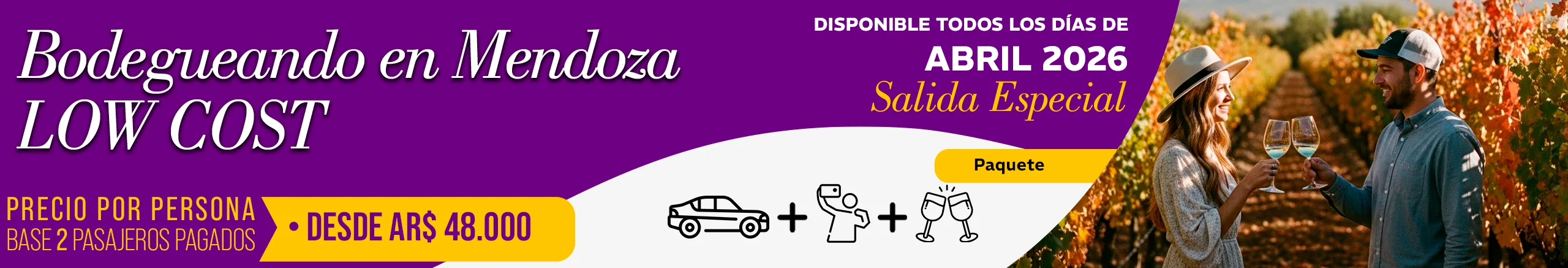 Conocé nuestros recorridos por los Caminos del Vino de Mendoza. Partimos diariamente desde la Ciudad de Mendoza —Capital Internacional del Vino— para explorar las zonas vitivinícolas más prestigiosas: Luján de Cuyo, Maipú y Valle de Uco.