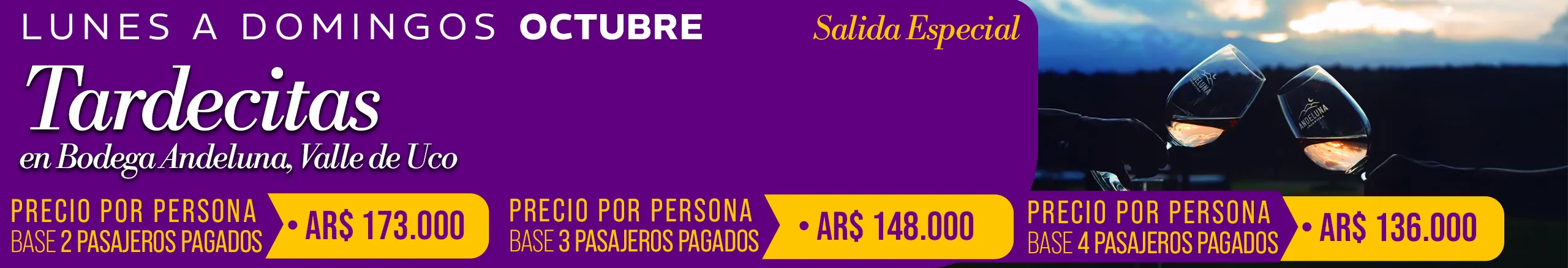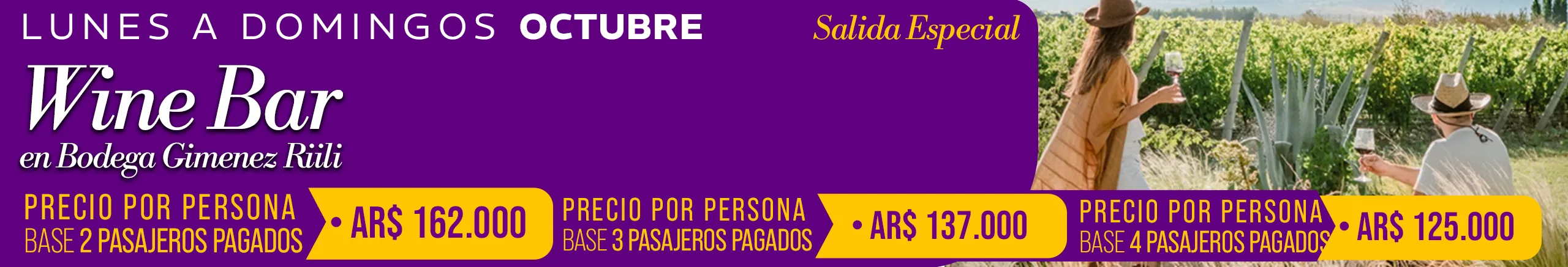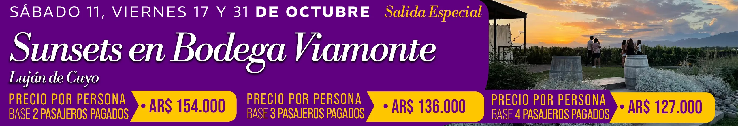 -Jueves 02/10/2025 Camino del Vino Lujan Tierra Malbec: Bodega Norton NO estará disponible para almuerzo el restaurante se encuentra cerrado por un corte de gas general hasta el viernes 3/10/2025 inclusive, Para almuerzo sólo Bodega Mauricio Lorca esta disponible. -Viernes 10/10/2025 Camino del Vino Lujan Sur HALF DAY TARDE: Bodega Chandon NO estará disponible para visita con degustación. En su lugar estará disponible Bodega Cruzat (espumantes) para visita y degustación-Precio por persona AR $ 20.000 -Jueves 23/10/2025 Camino del Vino Lujan de Cuyo Tierra Malbec: Bodega Renacer NO nos puede recibir por evento privado. En su lugar estará disponible Bodega Cruzat (espumantes) para visita y degustación-Precio por persona AR $ 20.000 -Viernes 24 y 31 de Octubre de 2025 Camino del Vino Lujan Sur: Bodega Casarena no estará disponible por evento privado. Para almuerzo sólo Bodega Terrazas de Los Andes estará disponible. -Sábados 4 y 11 de octubre de 2025 Camino del Vino Grandes Leyendas de Maipú: Informamos que Bodega López no ofrecerá servicio de almuerzo debido a trabajos de refacción en su restaurante. En su reemplazo, Bodega Trivento será la opción disponible para el almuerzo, con Menú Mendoza – Precio por persona: AR$ 40.000.