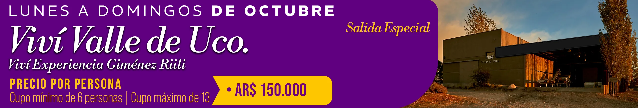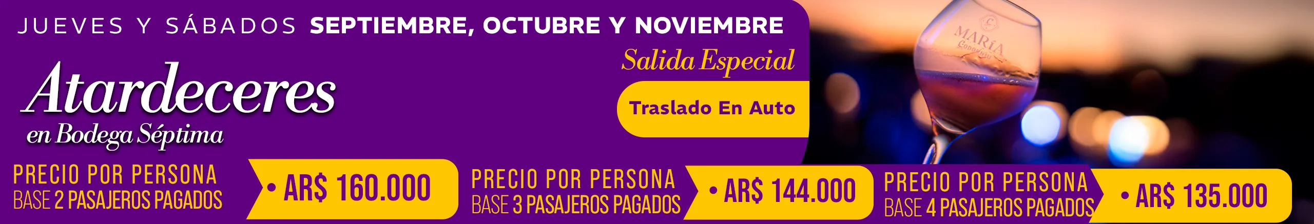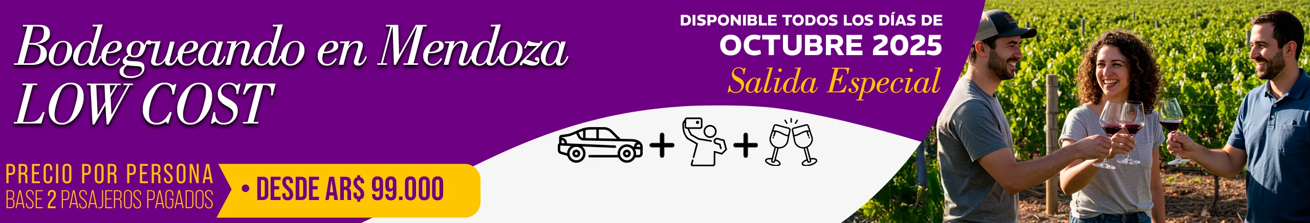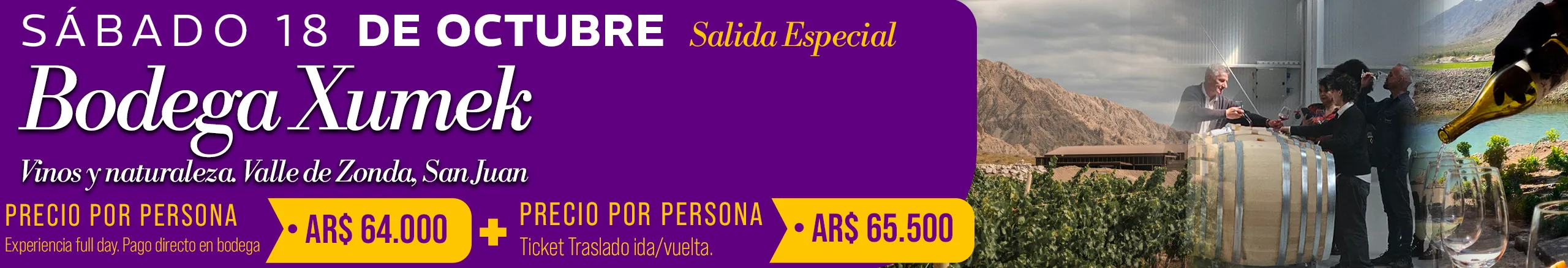 -Jueves 02/10/2025 Camino del Vino Lujan Tierra Malbec: Bodega Norton NO estará disponible para almuerzo el restaurante se encuentra cerrado por un corte de gas general hasta el viernes 3/10/2025 inclusive, Para almuerzo sólo Bodega Mauricio Lorca esta disponible. -Viernes 10/10/2025 Camino del Vino Lujan Sur HALF DAY TARDE: Bodega Chandon NO estará disponible para visita con degustación. En su lugar estará disponible Bodega Cruzat (espumantes) para visita y degustación-Precio por persona AR $ 20.000 -Jueves 23/10/2025 Camino del Vino Lujan de Cuyo Tierra Malbec: Bodega Renacer NO nos puede recibir por evento privado. En su lugar estará disponible Bodega Cruzat (espumantes) para visita y degustación-Precio por persona AR $ 20.000 -Viernes 24 y 31 de Octubre de 2025 Camino del Vino Lujan Sur: Bodega Casarena no estará disponible por evento privado. Para almuerzo sólo Bodega Terrazas de Los Andes estará disponible. -Sábados 4 y 11 de octubre de 2025 Camino del Vino Grandes Leyendas de Maipú: Informamos que Bodega López no ofrecerá servicio de almuerzo debido a trabajos de refacción en su restaurante. En su reemplazo, Bodega Trivento será la opción disponible para el almuerzo, con Menú Mendoza – Precio por persona: AR$ 40.000.