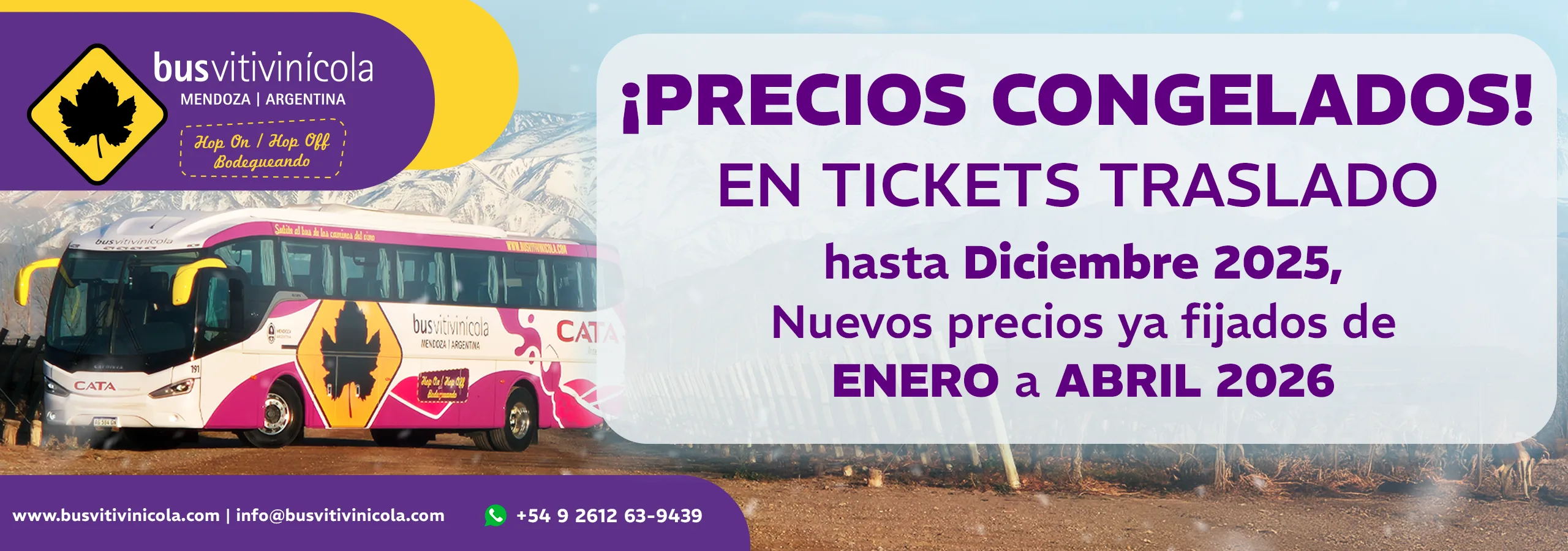 -Jueves 23/10/2025 Camino del Vino Lujan de Cuyo Tierra Malbec: Bodega Renacer NO nos puede recibir por evento privado. En su lugar estará disponible Bodega Cruzat (espumantes) para visita y degustación-Precio por persona AR $ 20.000 -Viernes 17, 24 y 31 de Octubre de 2025 Camino del Vino Lujan Sur: Bodega Casarena no estará disponible para almuerzo por evento privado. Sólo Bodega Terrazas de Los Andes estará disponible. Pero sí estará disponible para visita y degustación para aquellos pasajeros que hagan Half Day Tarde. -Sábado 11 de octubre de 2025 Camino del Vino Grandes Leyendas de Maipú: Informamos que Bodega López no ofrecerá servicio de almuerzo debido a trabajos de refacción en su restaurante. En su reemplazo, Bodega Trivento será la opción disponible para el almuerzo, con Menú Mendoza – Precio por persona: AR$ 40.000.